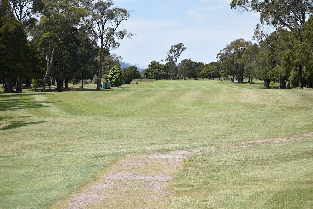 A creek runs along the left fairway edge and trees on the right are waiting for wayward shots.